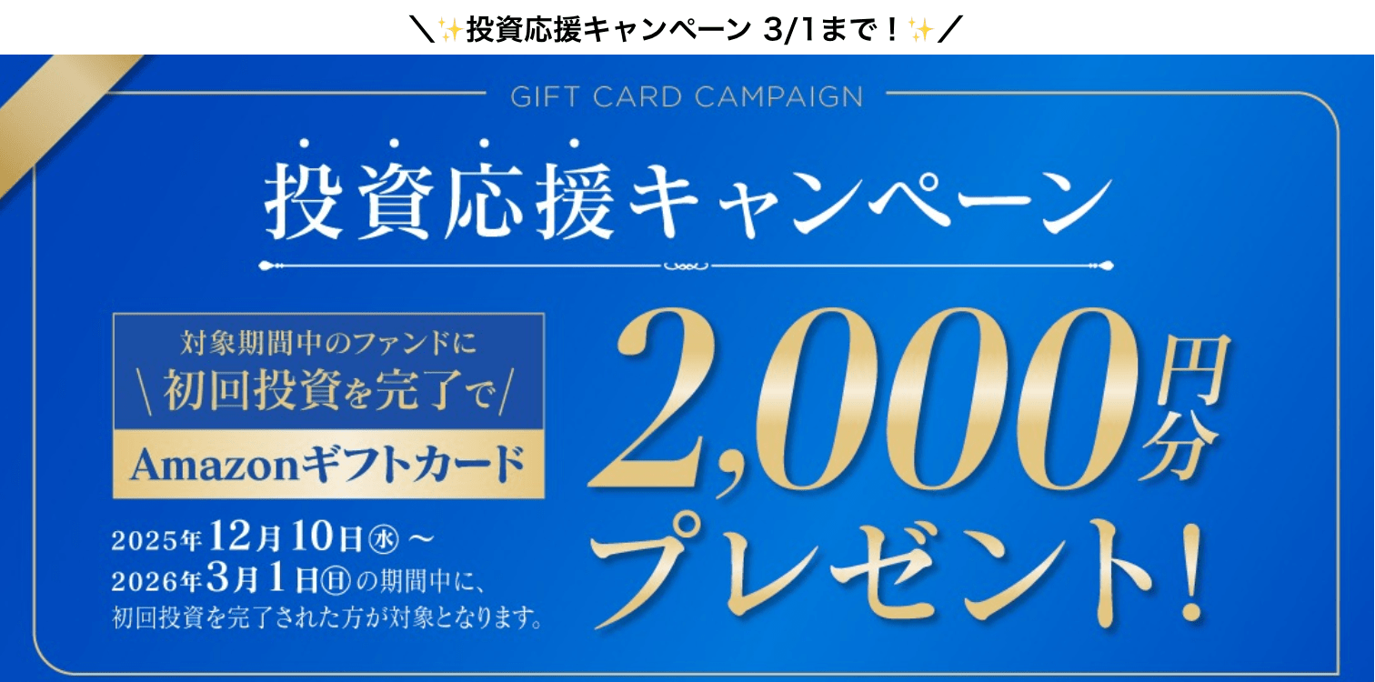 - 初回投資完了で、Amazonギフトカード2,000円分がもらえる