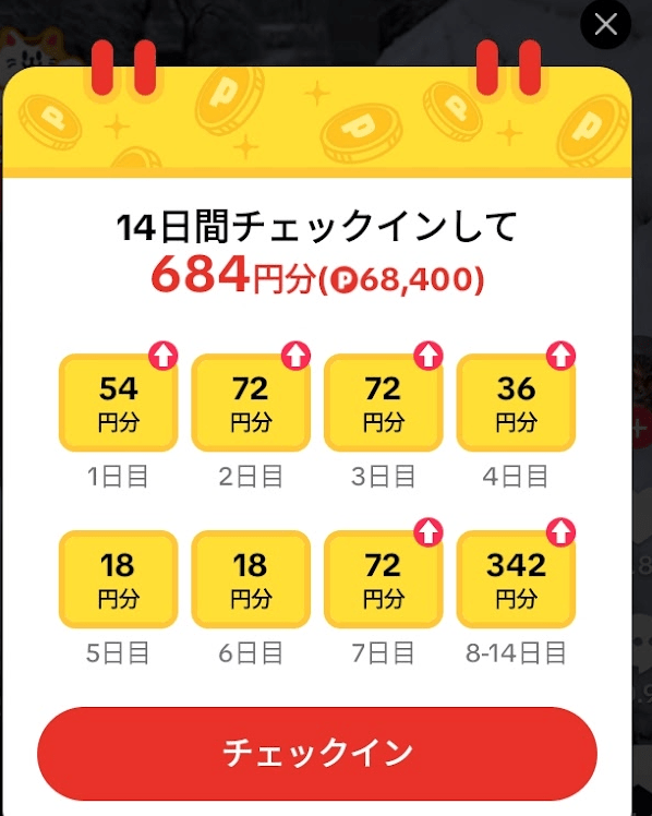 特に初回登録から14日間の連続チェックイン期間中はボーナスが上乗せされることが多く、ここで一気に稼ぐのがコツです。