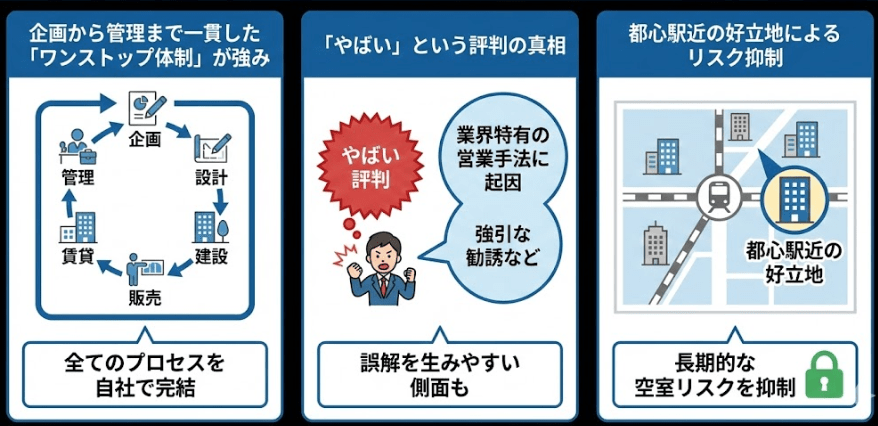 同社の事業は多岐にわたり、投資用マンションの企画・販売から、その後の賃貸管理までをカバーしています。