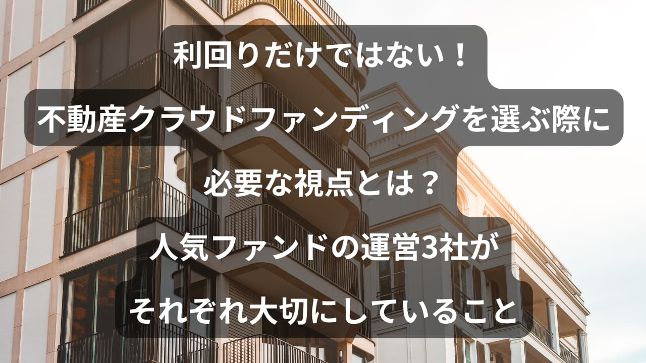 利回りだけではない!不動産クラウドファンディングを選ぶ際に必要な視点とは?人気ファンドの運営3社がそれぞれ大切にしていること
