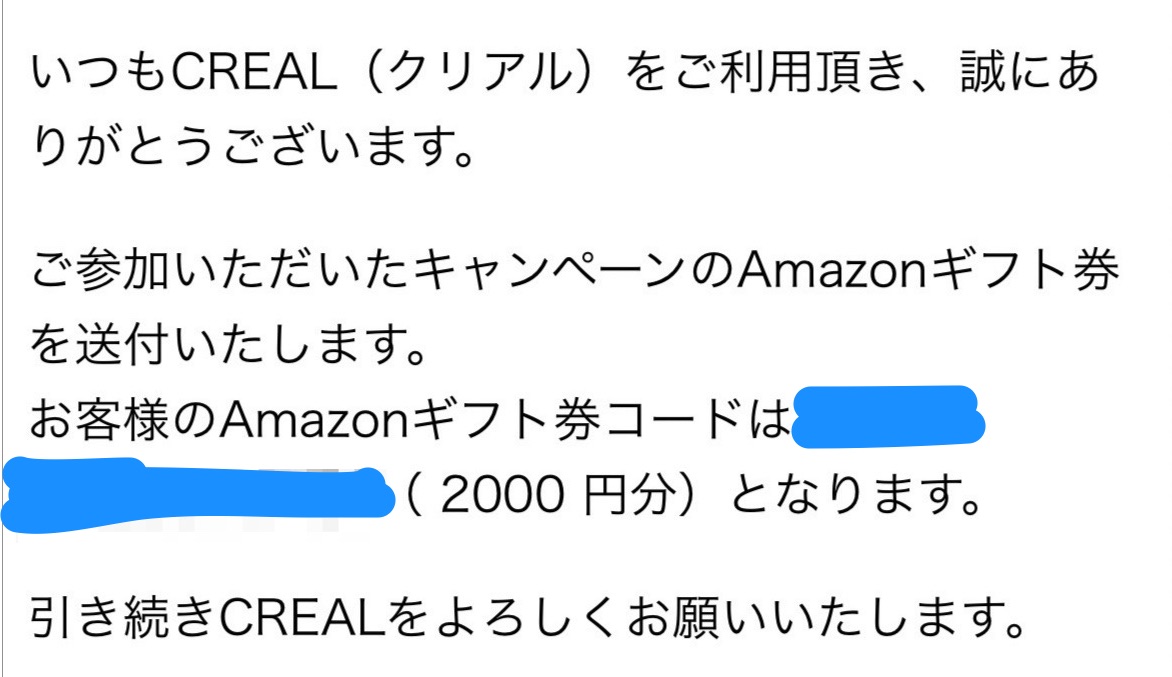 キャンペーン条件を満たした方に、CREALより登録メールアドレス宛にAmazonギフト券コードが送付されます。
