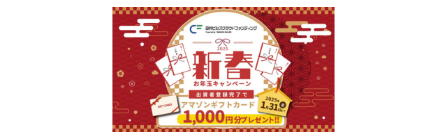 期間中に出資者登録をしていただいた方全員に、アマゾンギフト券1,000円分をプレゼントいたします。