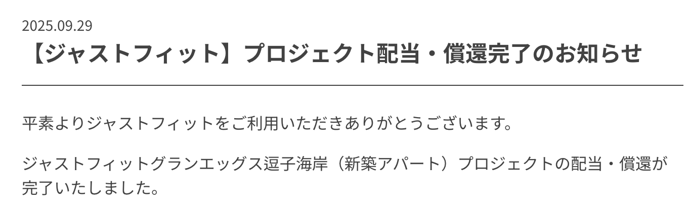 過去のジャストフィットでの投資履歴は以下の記事を参考にしてください。(運営会社についてもまとめています)