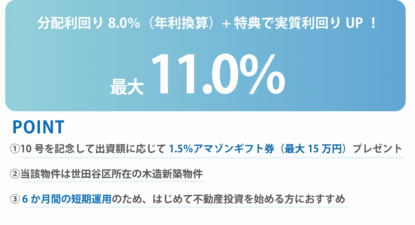 - ・50口以上の投資でアマギフ1.5%(上限15万円)⇒実質利回り約11.0%