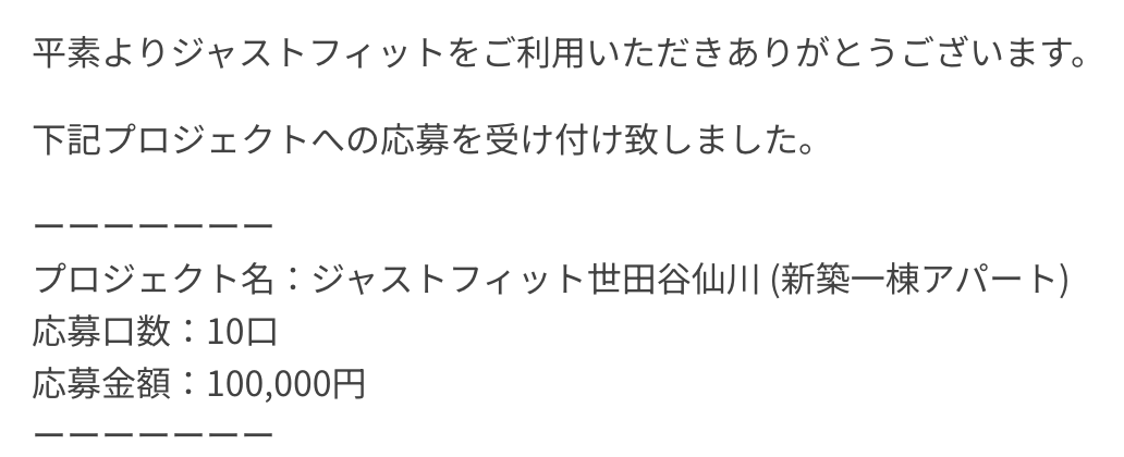 新規募集の「ジャストフィット世田谷仙川(新築一棟アパート)」に10万円を出資しました。