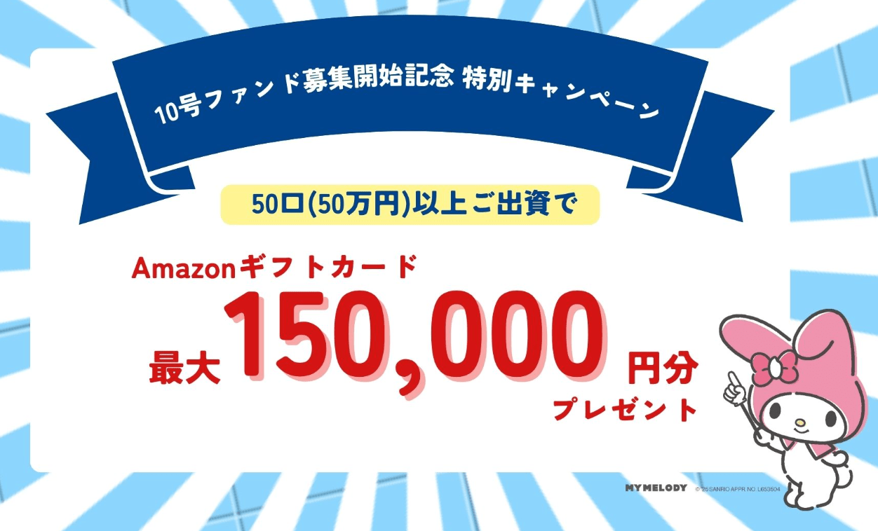 本ファンドは第10号を記念して、50口(50万円)以上の出資で出資金額の1.5%分のAmazonギフトカードがもらえます。