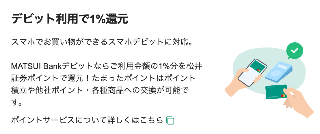 松井バンクのデビットカード利用で、最大1%の松井証券ポイントが貯まります。