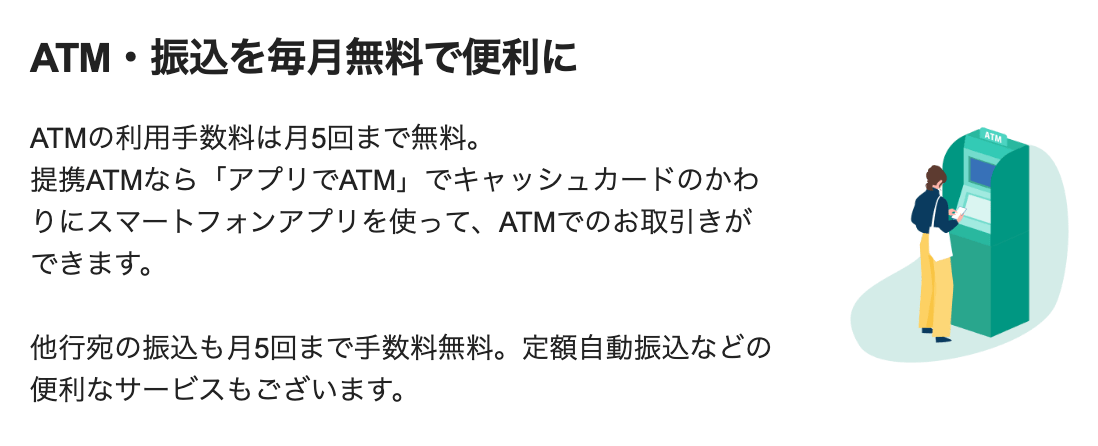 全国の主要ATMでの出金や他行振込が、月5回まで無料になります。