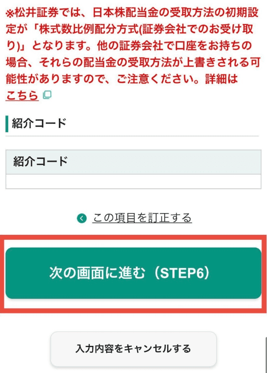 紹介コードをお持ちの方は入力し「次の画面に進む(STEP5)」をタップします。