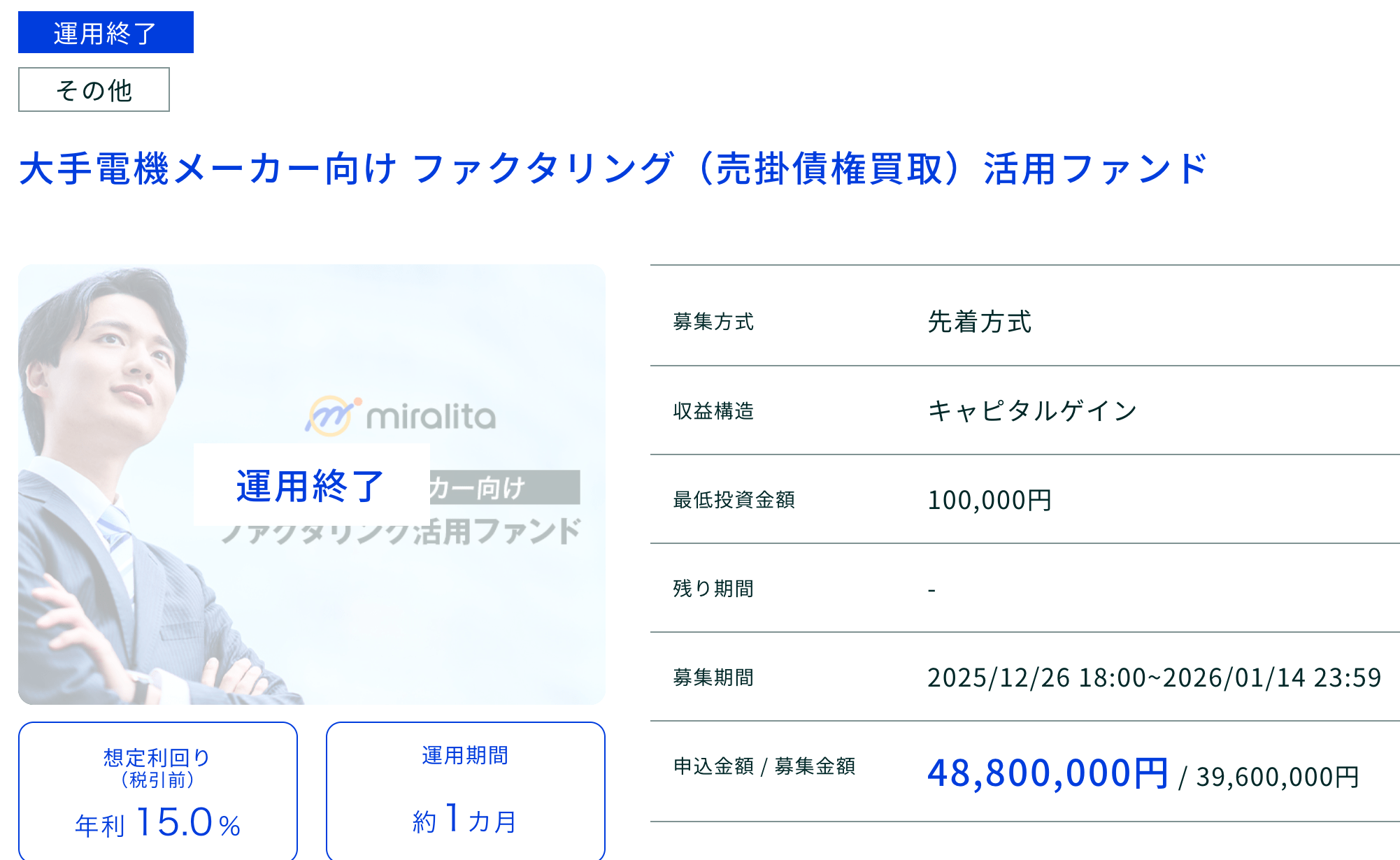 ミラリタの大きな強みの一つに、運用期間が非常に短い「短期完結型」の案件があります。