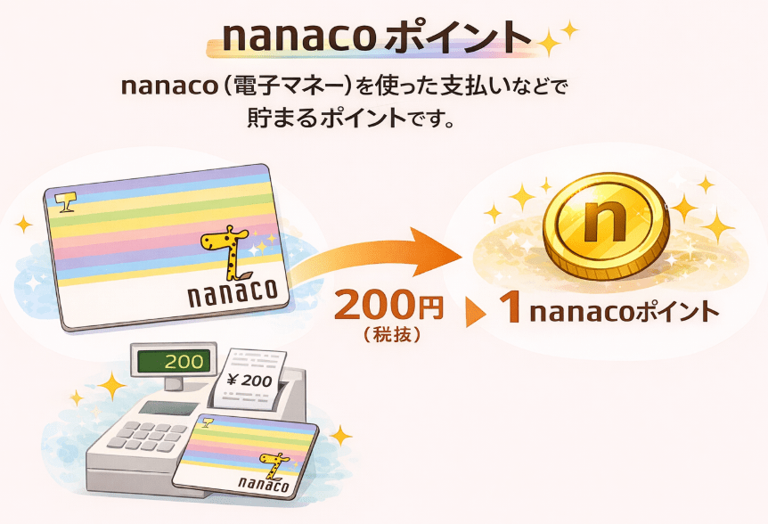 nanacoポイントは、nanaco(電子マネー)を使った支払いなどで貯まるポイントです。