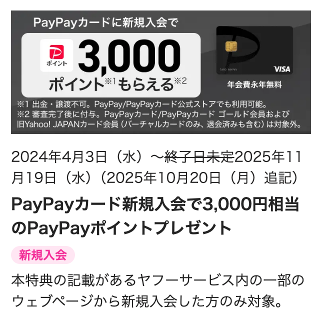 2025年11月19日までは、PayPayカードに新規入会すると最大3,000円相当のPayPayポイントが付与されます。