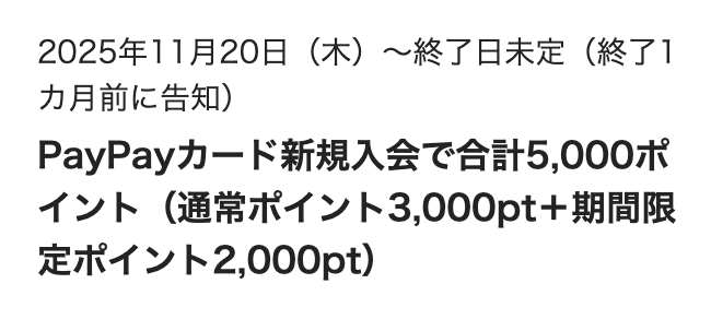 2025年11月20日からは、PayPayカード新規入会で最大5,000ポイントが受け取れる予定です。