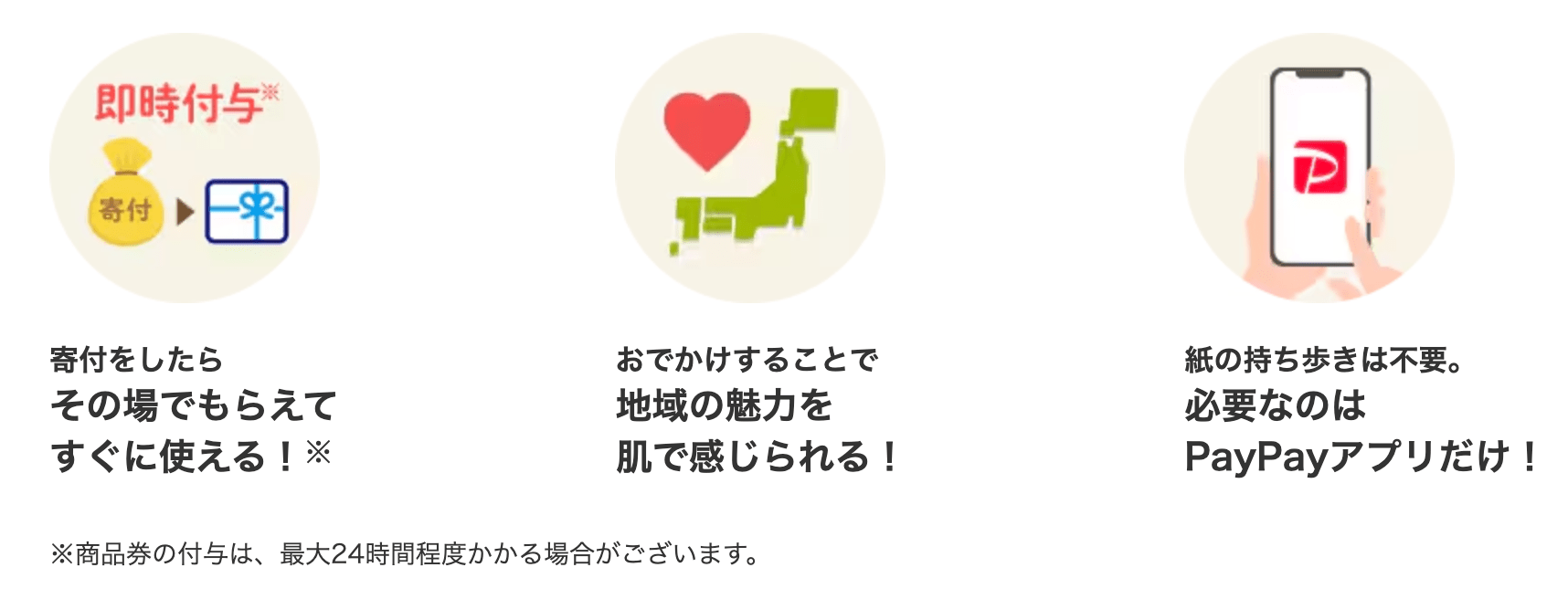 寄付手続きを行うと、即時にPayPay商品券が付与され、地元店舗や宿泊施設などで利用可能です。