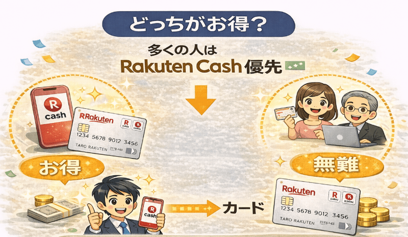 - ・どっちがお得?→多くの人は「楽天キャッシュ優先」が堅い(同条件ならキャッシュ→カードの順が無難)