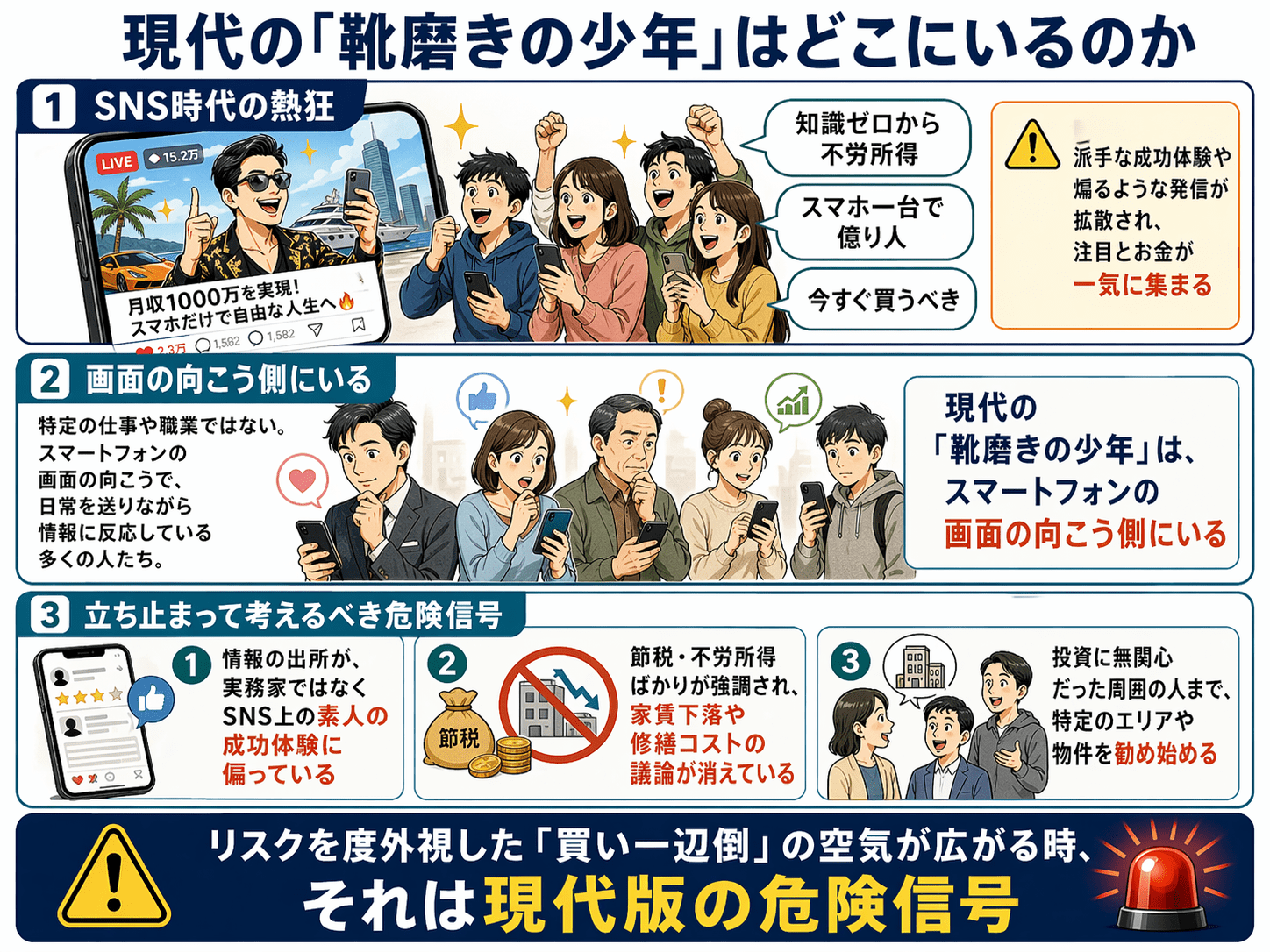 - 「節税」や「不労所得」ばかりが強調され、家賃下落や修繕コストの議論が消えている。