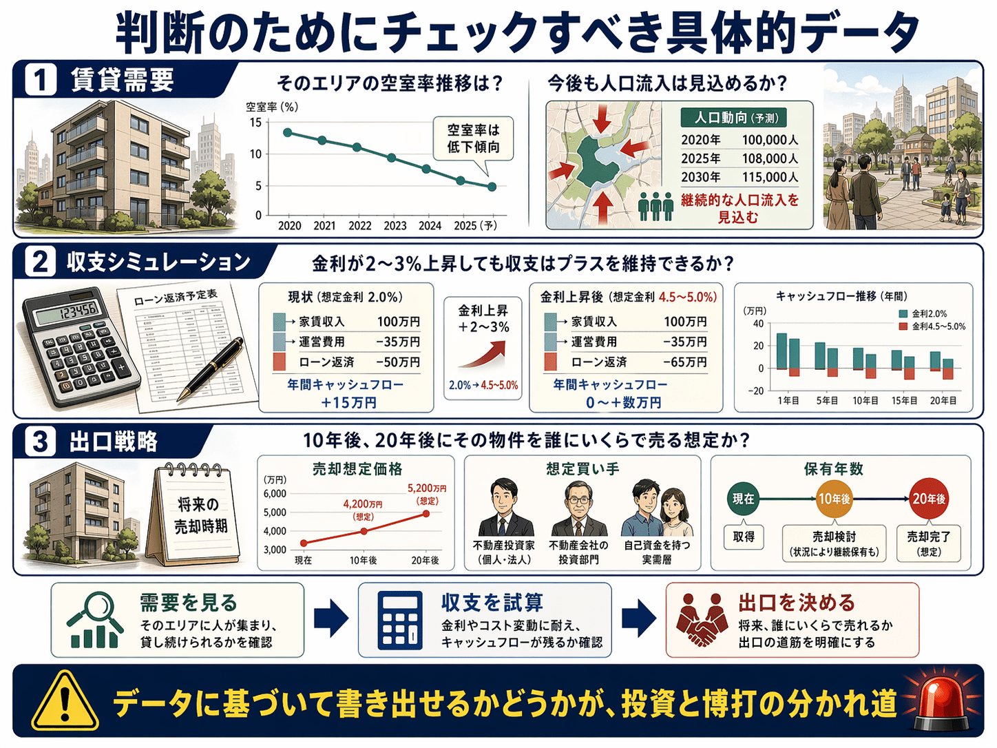 ローン返済、入居者対応、修繕、税金、売却戦略などを考慮する必要がある