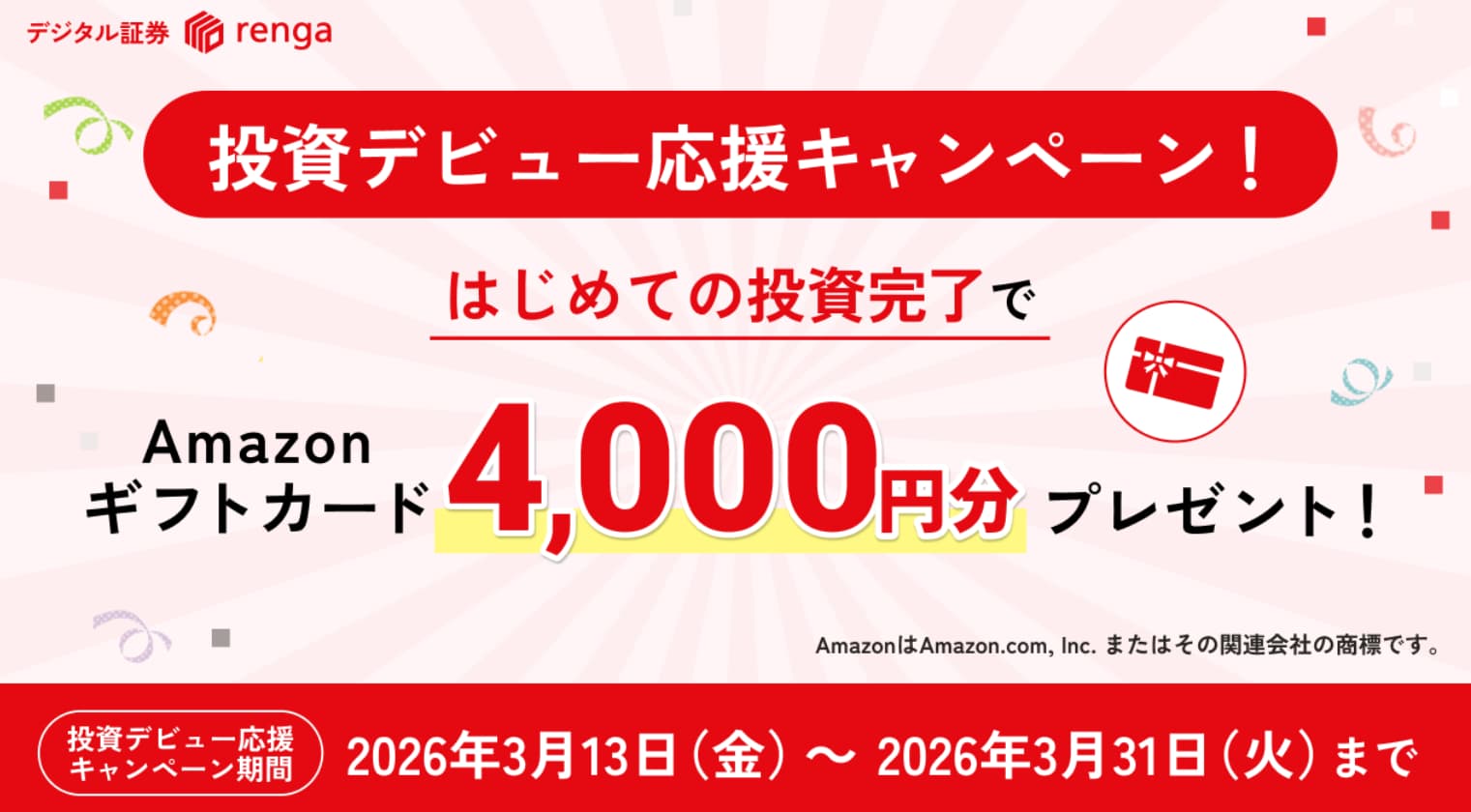 【最新】投資デビュー応援キャンペーン|Amazonギフト券4,000円分(2026/3/13〜3/31)