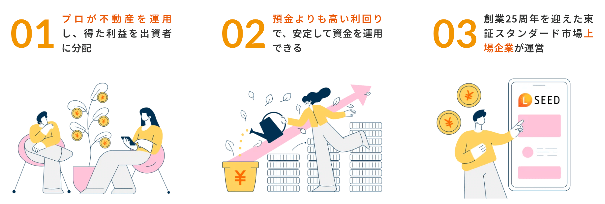 「LSEED」は、複数の投資家から集めた資金で不動産の取得・運用を行います。