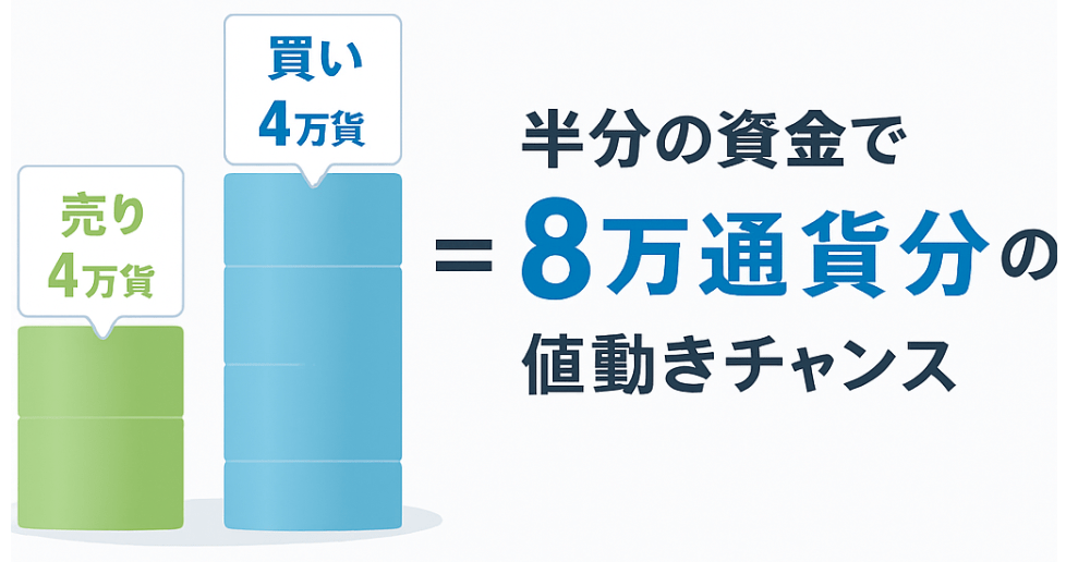 この場合、必要な証拠金は「4万通貨分だけ」でよく、「8万通貨=2倍の資金」は必要ありません。