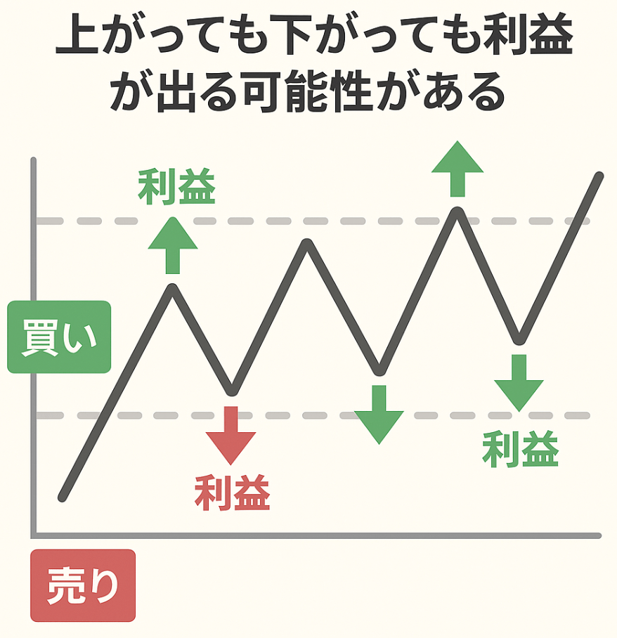 相場が上昇した場合は買い側で、下落した場合は売り側で利益を積み重ねることができます。