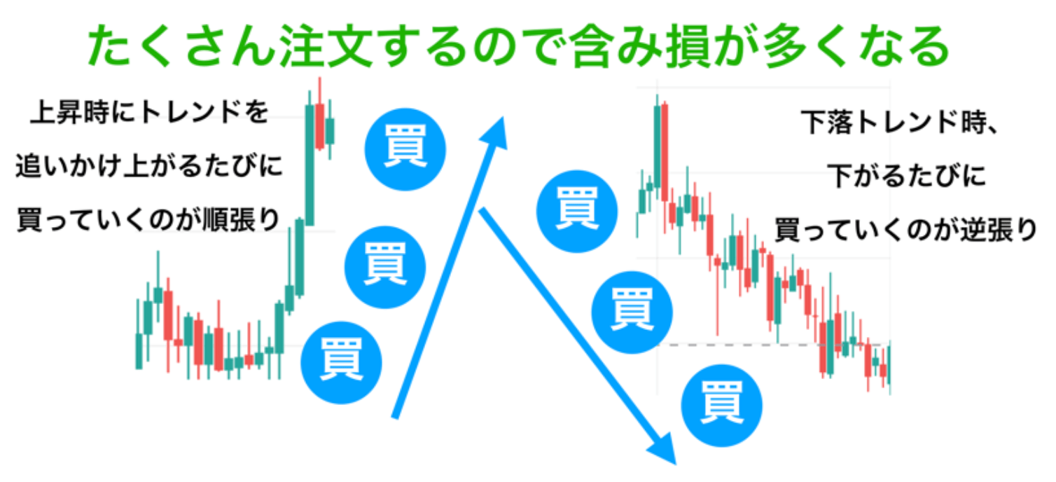 - ・ポジションが増えやすく、ロスカットで損失が大きくなりやすい