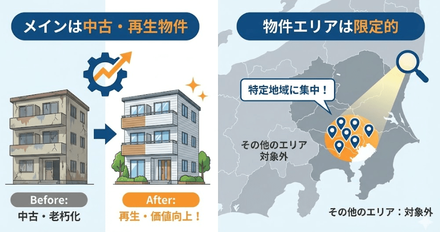 建物の新しさよりも、土地の潜在能力や収益性を重視する人向けの会社と言えるでしょう。