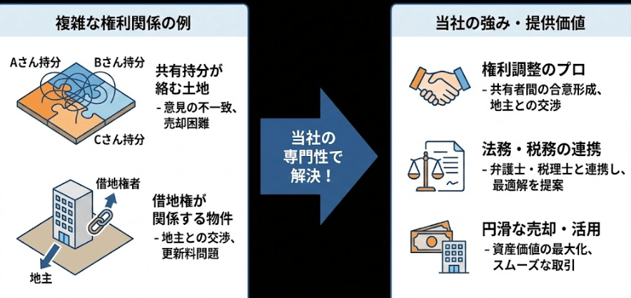 複雑な権利関係が絡む物件の扱いに強み