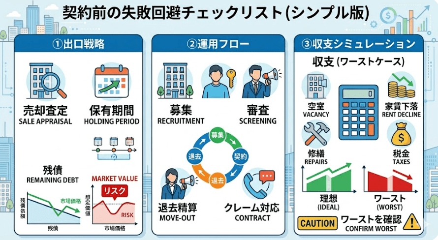 不動産投資では、契約・収支計算・出口戦略の3点セットを押さえることが大切。