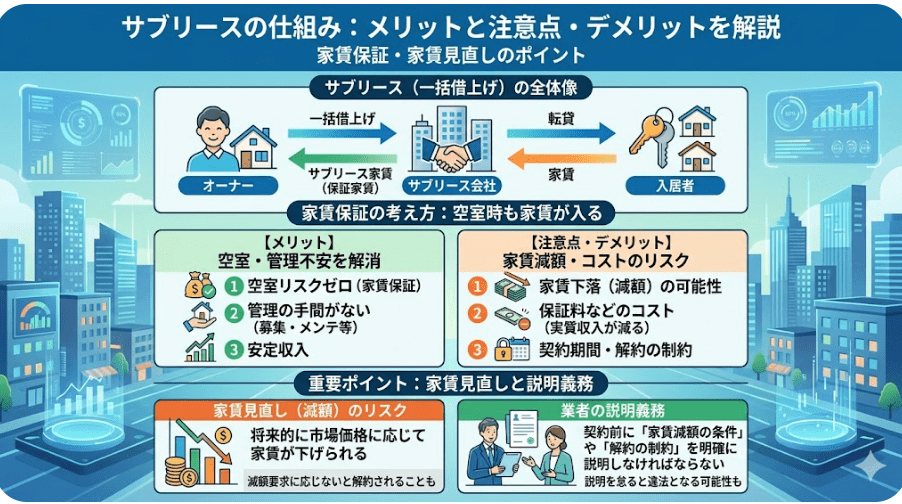 - ・サブリースは空室でも家賃が入りやすい一方、家賃見直し(減額)や解除条件がトラブル論点になりやすい