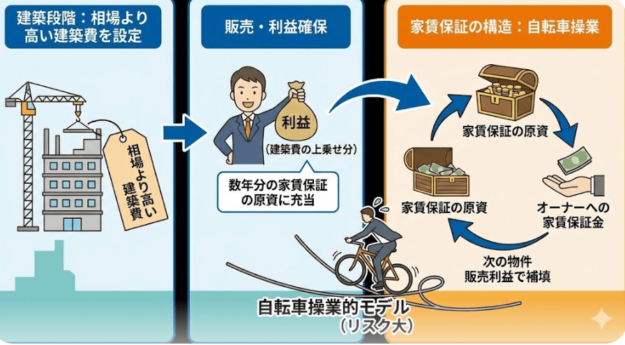 物件の建築費を相場より高く設定し、その利益を数年間の家賃保証に回すという「自転車操業」的なモデルです。
