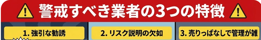 - ・警戒すべき特徴は「強引な勧誘」「リスク説明の欠如」「売りっぱなしで管理が雑」の3つ