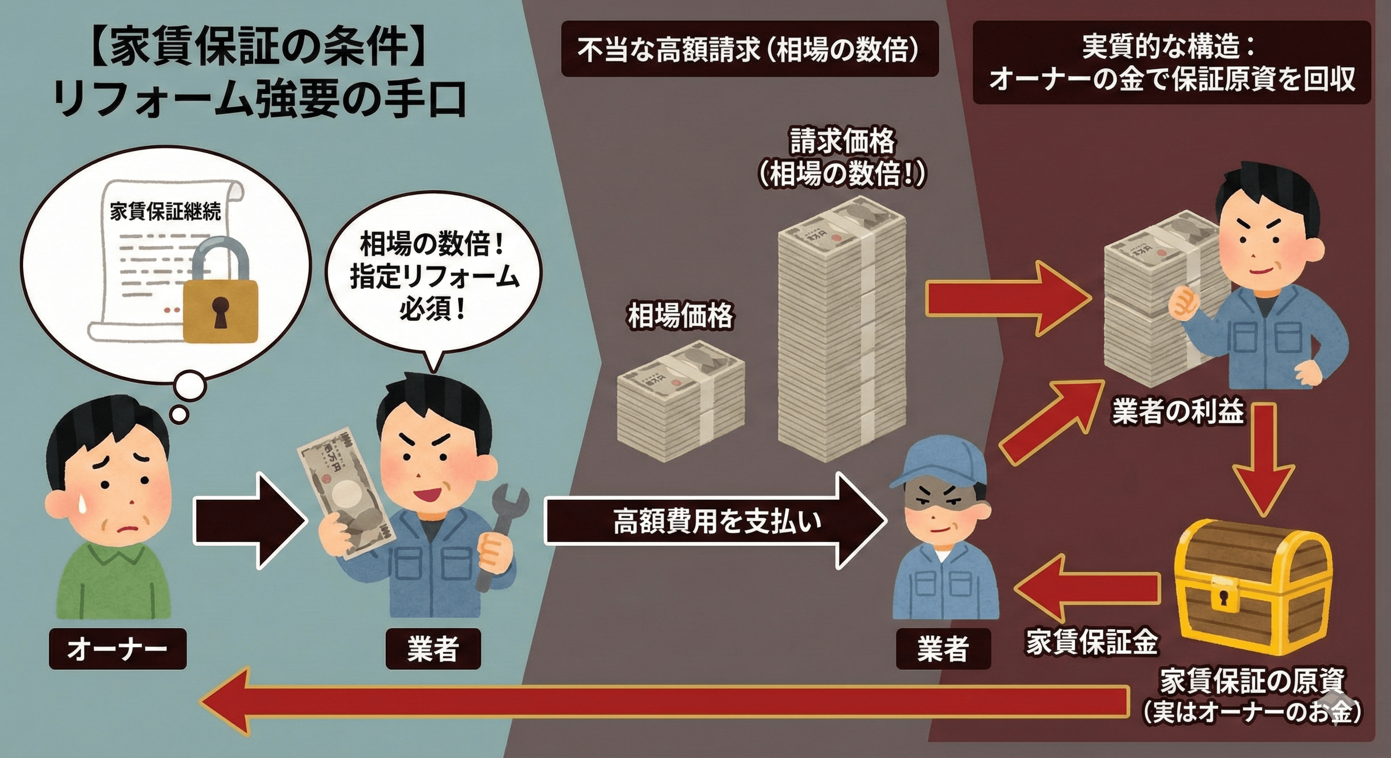 家賃保証を継続する条件として、業者指定の価格でリフォームを行うよう迫る手口です。