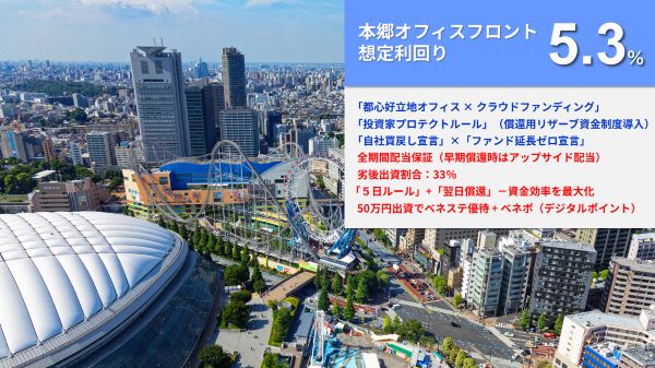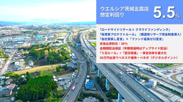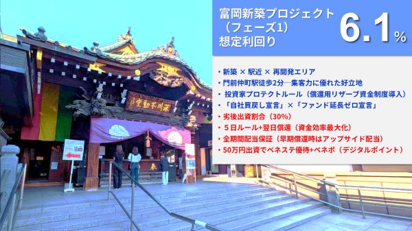 凄まじい応募率で人気を集めてる。利回りが6%と高く、配当・償還までの期間が短いため資金効率が高く、早期償還時の配当保証付きのファンドも7号から出ているため、期待している事業者。ファンドが出るたびに企画が違うので、毎回良い勉強をさせてもらってます。